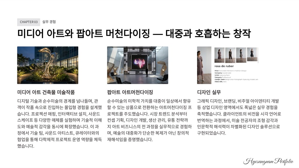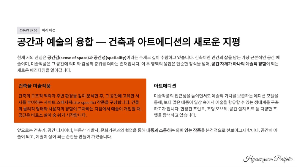 3. B2B 건설 관련 사업 상담 남혜성 작가(플로시)은 건설 분야의 미술 작품 설치 및 조형물 제작에 대한 깊이 있는 이해와 실무 경험을 갖추고 있습니다. 건축물의 미적 가치를 높이는 조경 디자인 및 조형물 설치, 건축물 미술 작품 심의 대응, 공간 디자인 컨설팅 등 귀사의 건설 프로젝트에 시너지를 더할 수 있는 다양한 B2B 솔루션을 제공할 수 있습니다. 관련 프로젝트에 대한 깊이 있는 상담을 통해 귀사의 성공적인 사업 수행에 기여할 수 있기를 바랍니다.