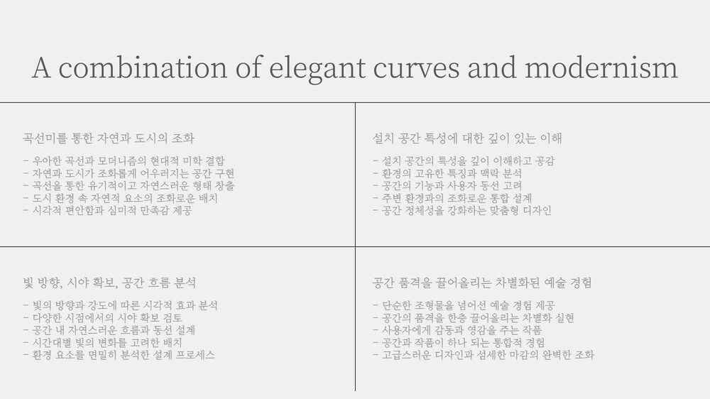 저희 회사의 조각 작품은 우아한 곡선과 모더니즘의 현대적 미학을 완벽히 결합하여, 설치 공간의 특성을 깊이 이해하고 이에 적극적으로 공감하는 고급스러운 디자인과 섬세한 마감을 자랑합니다. 특히, 곡선미를 통해 자연과 도시가 조화롭게 어우러지는 공간을 구현하며, 작품이 설치되는 환경의 빛 방향, 시야 확보, 공간 흐름 등 요소를 면밀히 분석한 후 설계함으로써, 단순한 조형물을 넘어 공간의 품격을 한층 끌어올리는 차별화된 예술 경험을 제공합니다.