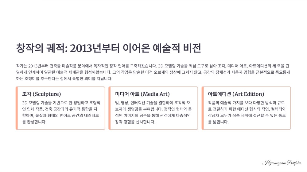 저는 국민대 미술학부에서 순수미술을 전공하였으며, 학부 시절 순수미술과 더불어 현대철학, 고전철학, 그리고 비평을 함께 공부하며 사회 문제에 대한 깊은 관심과 인문학적 통찰력을 길렀습니다. 이러한 배경은 제가 복잡하고 다층적인 산업 및 기업 환경을 심층적으로 분석하는 능력으로 발전하였고, 논리적이며 설득력 있는 자료와 보고서로 명확하게 의사를 전달하는 커뮤니케이션 역량을 갖추게 해주었습니다. 대학 재학 중에는 특히 비평적 사고를 집중적으로 연마하여 문제의 본질을 꿰뚫는 시야를 넓혔으며, 미래 트렌드를 예측하는 능력도 키웠습니다. 졸업 이후에는 미디어 아트와 대중적인 팝아트 아트 머천다이징, 그리고 패션 디자인 현장에서 실무 경험을 쌓으며 대중과 호흡하는 창작 활동을 지속하고 있습니다. 패션 디자인 분야에서는 산업구조와 금융시장에 대한 분석을 체험하며 인문학적 통찰력과 현실적인 실무 노하우를 결합하여 변동성이 높은 환경 변화에 선도적으로 대응하고 있습니다. 현재 저는 특히 공간감과 공간성에 깊은 관심을 두고 건축과 예술의 융합을 모색하고 있습니다. 이를 토대로 건축물 미술작품과 아트에디션 분야에 본격적으로 참여하여, 공간과 조형미가 어우러지는 작품을 통해 대중과 소통할 계획입니다. 이 과정에서 특히 지속 가능성과 미적 완성도, 기술적 완성도에 역점을 두고 있으며, 작품이 환경과 주민에게 긍정적인 영향을 미치도록 기여하고자 합니다. 그간의 경험을 토대로 인문학적 통찰과 실무 경험, 그리고 비평적 사고력을 통합하여 사회적 약자들의 목소리가 문화예술뿐 아니라 정책과 사회시스템에 반영될 수 있도록 노력해 왔습니다. 앞으로도 예술 및 디자인 분야에서 의미 있는 협업 기회를 적극 모색하며, 관련하여 궁금하신 점이나 소통하고 싶으신 부분이 있다면 언제든 편하게 연락 주시면 성심껏 응대하겠습니다. 감사합니다.